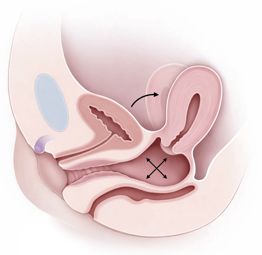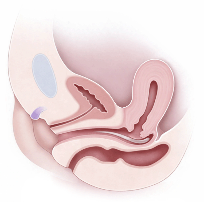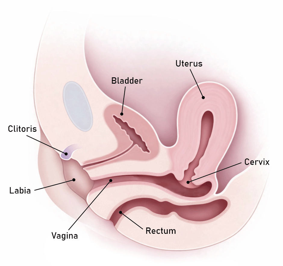 The following diagram shows a cross-section of a woman’s pelvic anatomy when in the normal unaroused state. The woman is lying face-up on a bed or other horizontal surface.